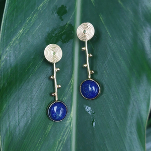 The Sunshine Lapis Drop Earrings, plated in 18K gold, feature a nature-inspired design that highlights the deep blue beauty of lapis stones. Their sophisticated elegance brings a refined, organic charm to both formal and casual western outfits, making them a timeless addition to your jewelry collection.