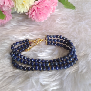 This stylish LAPIS LAZULI bracelet features three strings of beads interspersed with metal spacers. The beads are made of genuine lapis lazuli, a semi-precious stone valued for its blue-violet hue and golden specks. A perfect way to add a touch of elegance to any look.