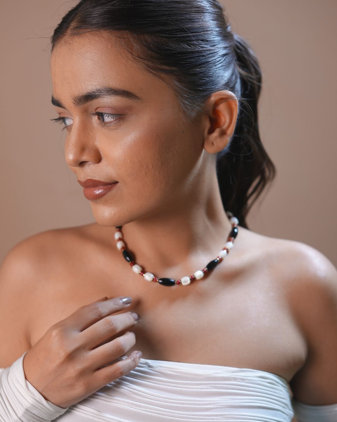 For a sophisticated look, pair the Onyx Mother-of-Pearl Necklace with a sleek black dress or a tailored white blouse. Its sparkling black onyx, smooth mother-of-pearl, and striking red coral beads create a refined contrast that adds depth and elegance, perfect for elevating both formal and chic evening ensembles.