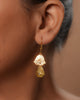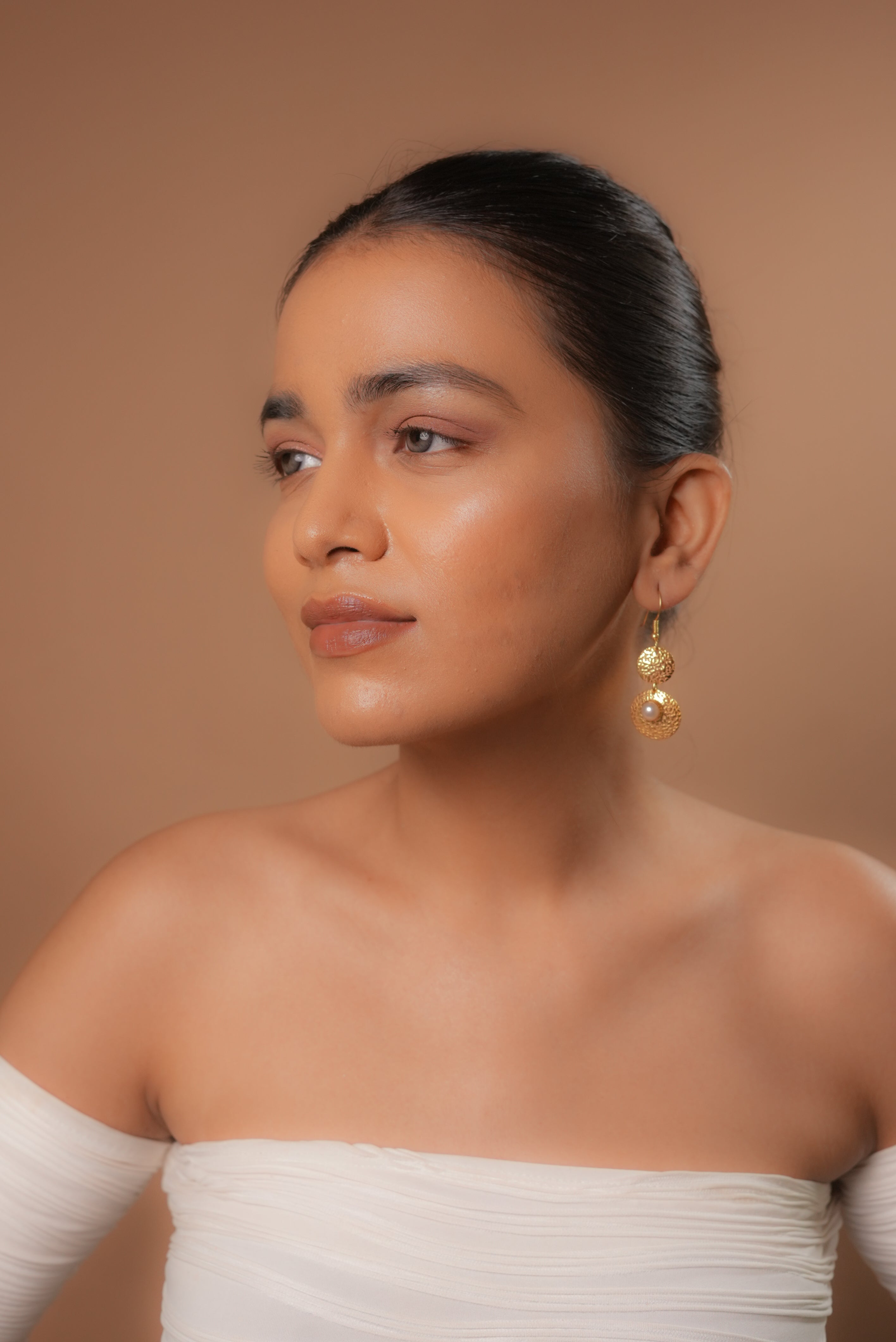 Experience refined elegance with these Hammered Double Rounds Earrings, featuring a graceful dangling design. A petite hammered round suspends a larger circular form adorned with cultured pearl studding, creating movement and dimension with every wear.