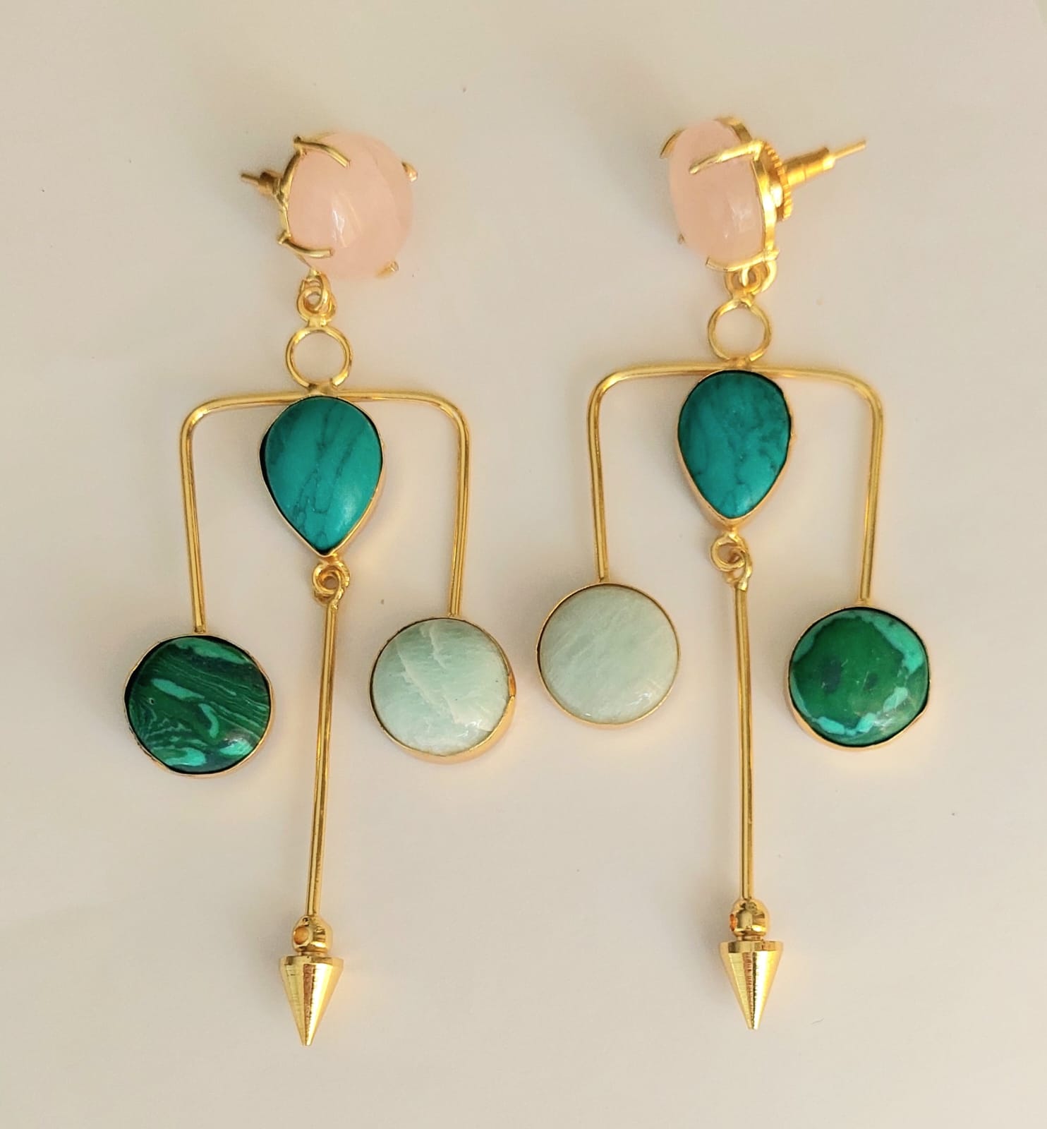 These sophisticated Multi-Gem Arrow Danglers showcase a stunning combination of Natural Rose Quartz, Green Amazonite. Designed to elegantly sway, they bring a refined touch of color and texture, perfect for enhancing both formal and chic everyday looks with subtle luxury and graceful movement..